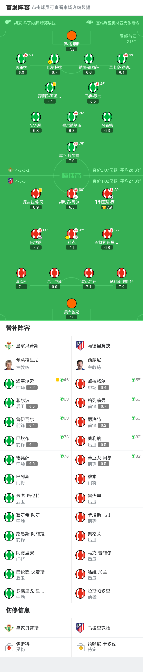 下半场,贝蒂斯试图发起反击。第58分钟,阿布德主罚任意球直接攻门,皮球击中横梁弹出,错失缩小比分的良机。此后,双方均无建树,马竞最终以2-0的比分赢得比赛。