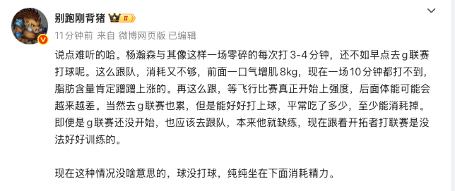 最后,该媒体人总结道:“现在这种情况没啥意思的,球没打好,纯纯坐在下面消耗精力。”