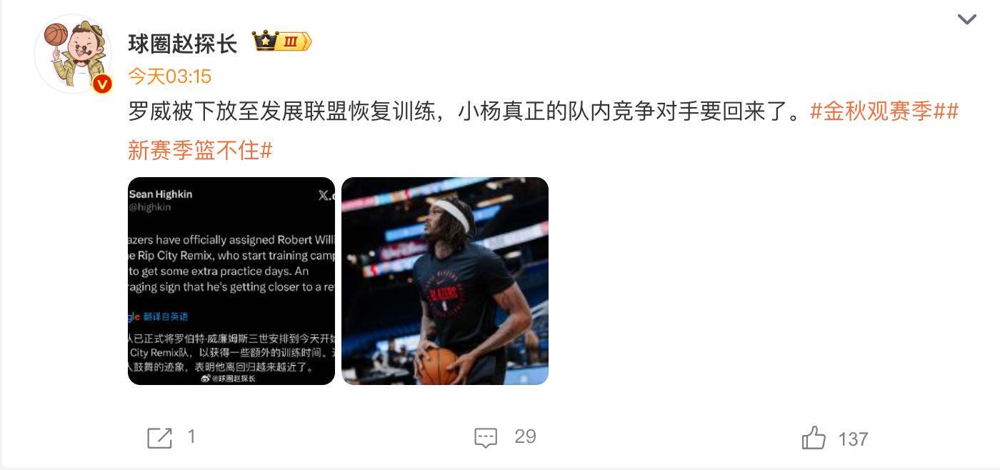 更令球迷揪心的是,波特兰开拓者官方近日宣布重要消息:球队主力中锋罗伯特·威廉姆斯(罗威)已接近复出。这位防守悍将此前因伤缺席多场比赛,期间克林根获得大量上场时间。据开拓者社交媒体披露,罗威目前正在发展联盟进行适应性训练,待体能恢复后将重返常规赛阵容。随着这位前最佳防守阵容成员的状态回升,开拓者内线竞争将愈发激烈。