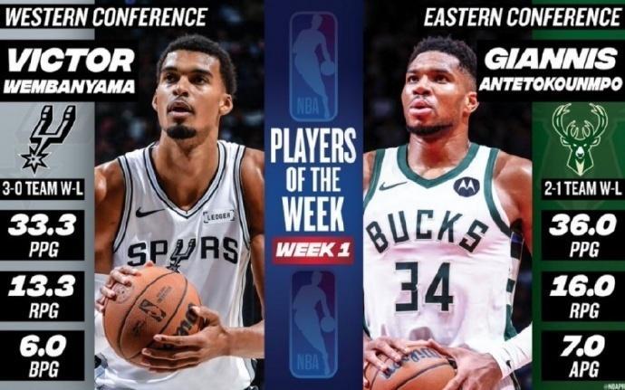 NBA官方宣布,字母哥和文班亚马分别当选了东西部第一周的周最佳球员。这一结果毫无争议,两人在第一周的表现极为强势。字母哥场均轰下36分16篮板7助攻,带领雄鹿取得2胜1负的成绩;文班亚马则场均轰下33.3分13.3篮板6封盖,带领马刺取得3胜0负的战绩。此外,库里、东契奇、亚历山大、马克西、布伦森等人也获得了提名。
