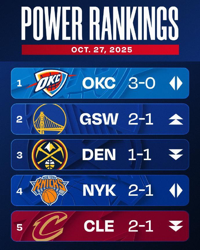 新赛季第一周打完,实力榜也进行了更新,排名发生了诸多变化。卫冕冠军依然高居榜首,勇士则冲至第二,掘金来到第三,尼克斯依然排在第四。接下来则是骑士、湖人、森林狼、马刺、快船和活塞。前10名中,西部球队占据7个席位,新赛季西部的竞争无疑将更加激烈。