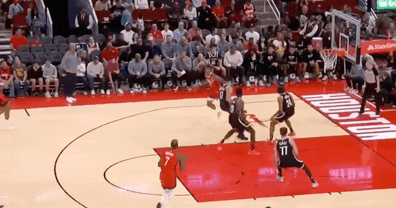 下半场回来,申京外线命中,奥科吉偷袭暴扣,篮网队很快叫出暂停。然而,暂停回来后,篮网队依旧手感冰凉,杜兰特篮下以一敌四打成2+1,但火箭队再次将分差拉开到20分以上。篮网队在第二节赖以生存的三分被全面限制,夏普不断地利用突破艰难地帮助球队得分。三节战罢,篮网队已经落后了26分,比赛基本盖棺定论。