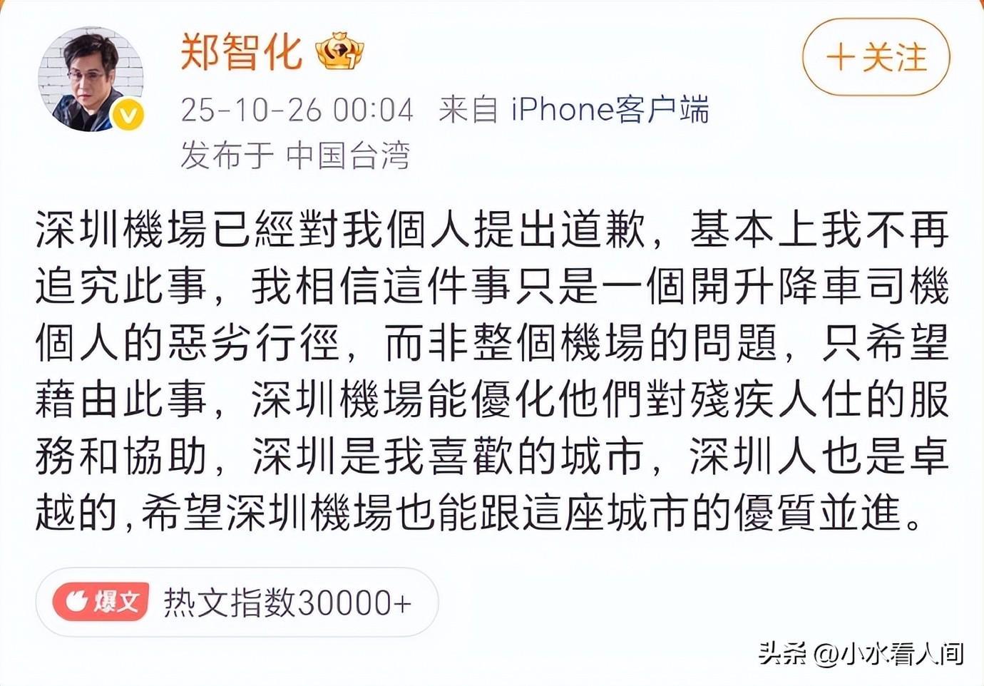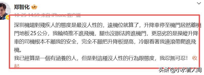 10月25日,台湾残疾人歌手郑智化在社交媒体上发文,指责深圳机场对残疾人“最没人性”。