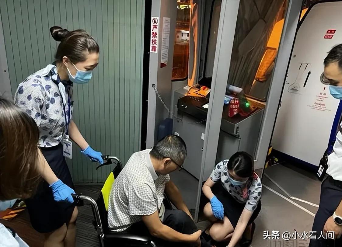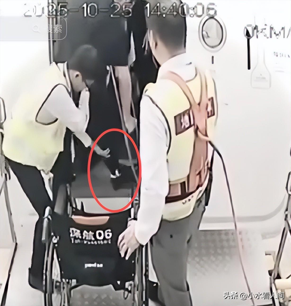 工作人员有的托举其腰部腿部,有的稳定轮椅,还有空姐在里头扶住他。