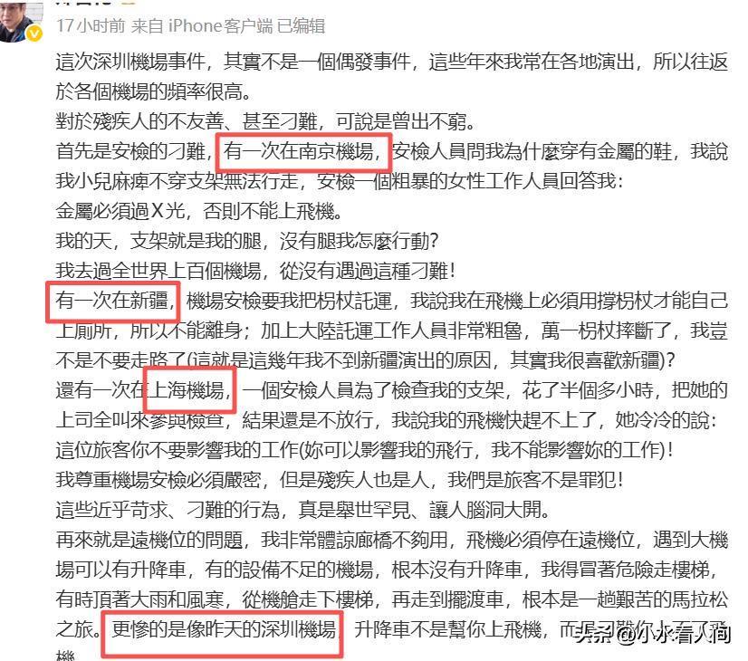 五位工作人员协助他登机,却被他用“最没有人性”来形容深圳机场,还有把帮助他的人用“冷眼旁观”形容,把帮他的人用“更恶劣”形容。