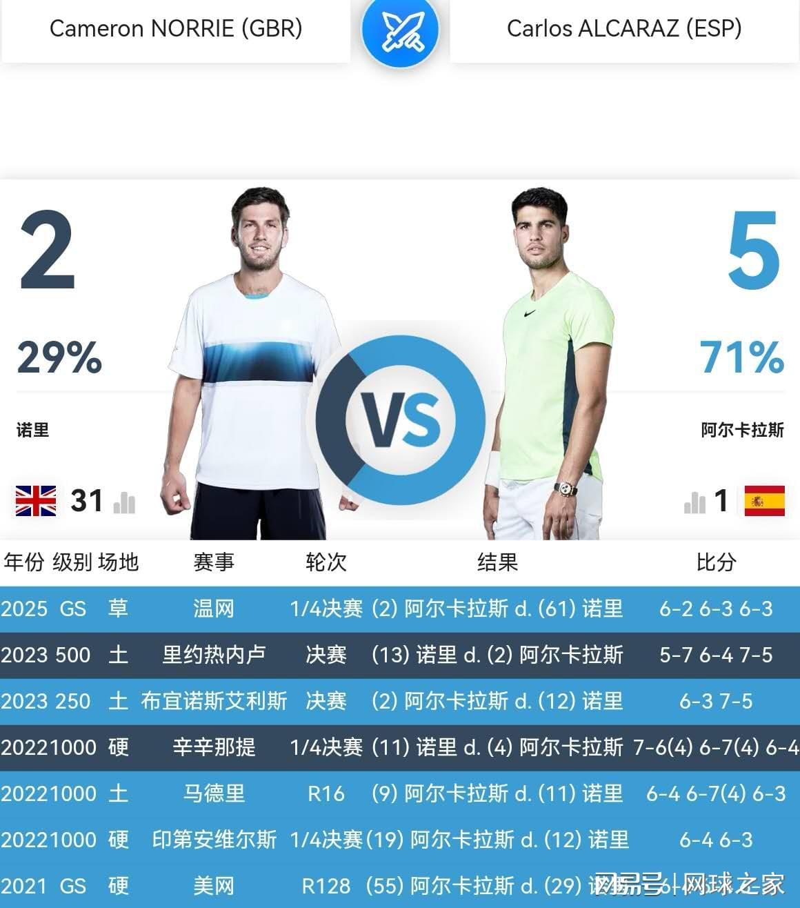 明天凌晨两点,巴黎大师赛第二轮将迎来一场焦点对决:世界第一、西班牙全能战士阿尔卡拉斯,将迎战英国老将诺里。作为西班牙战神纳达尔的忠实迷弟,两人不仅将在本赛季继温网1/4决赛后再次交锋,更将上演职业生涯第八次巅峰对决,用精彩表现向偶像致敬。