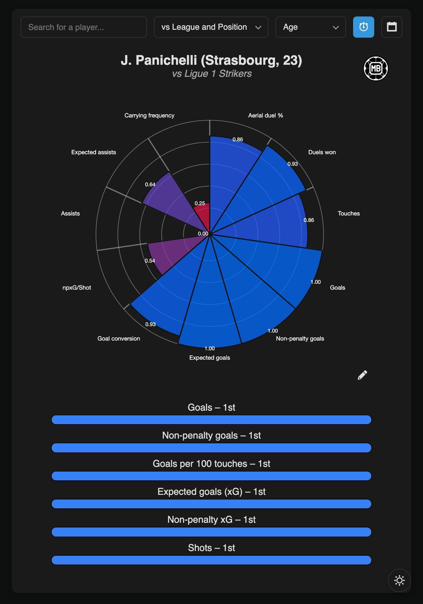 除了进攻端的惊艳表现,帕尼切利在防守端同样积极。他以场均1.2次抢回球权、0.8次拦截和1.5次防守对抗胜利,成为法甲最全面的前锋之一。其“超出预期进球表现”(xG outperformance)高达0.2,进一步证明他把握机会的能力远超数据模型预测。