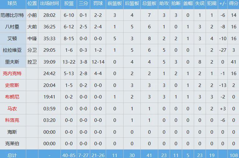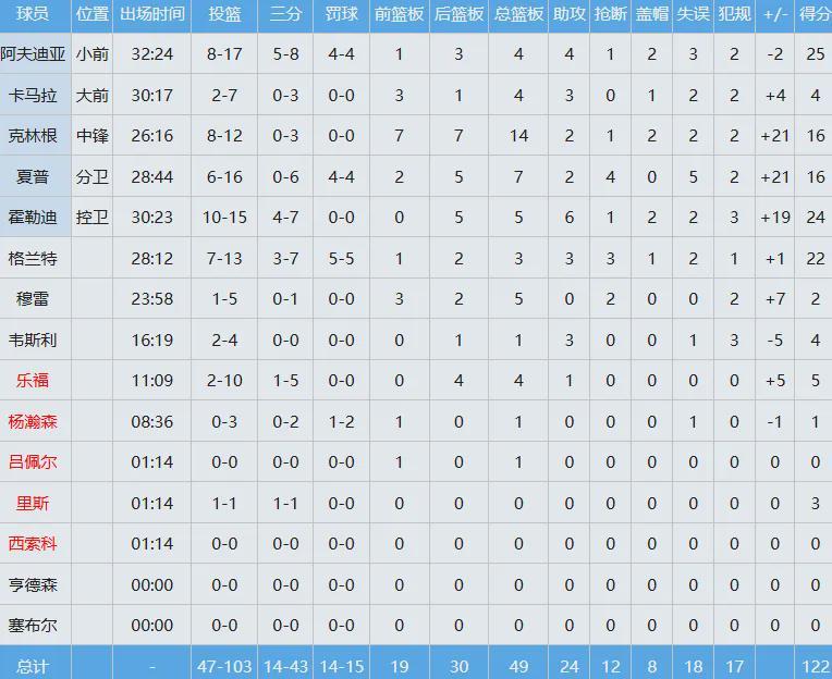 开拓者队中,三人得分20+,阿夫迪亚贡献25分4板4助,霍勒迪砍下24分5板6助,格兰特也有22分3板3助3断的全面表现。而克林根则凭借16分14板(7前场板)的两双数据,成为了球队内线的稳定支点。