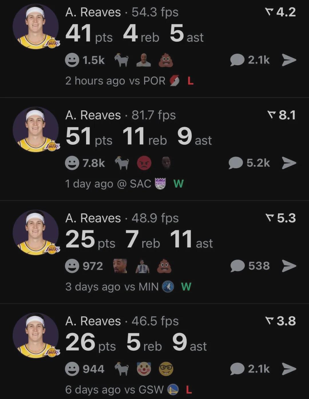 湖人那边,艾顿面对旧主砍下16分8板(5前场板)2助2断,而里夫斯则更是火力全开,狂轰41分4板5助3断,成为了球队进攻端的绝对核心。不得不说,里夫斯真的猛,背靠背合砍92分15板14助,在这单核带队的两场比赛里完美证明了自己的个人能力。