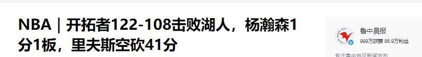 在NBA常规赛焦点战中,湖人主场108-122不敌开拓者。中国球员杨瀚森替补登场8分36秒,仅通过罚球得到1分并抢下1个篮板,而湖人核心里夫斯空砍41分5助攻3抢断。