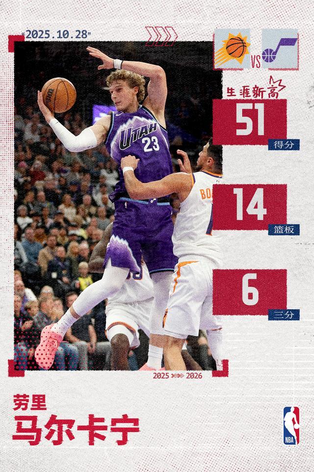 爵士与太阳的比赛,堪称经典的“今夜不设防”式的对决。两队都不缺乏得分高手,也都没有在本赛季封狼居胥的野心。但即便是在这样的情况下,马尔卡宁的这场华丽个人秀,也着实过于亮眼了。