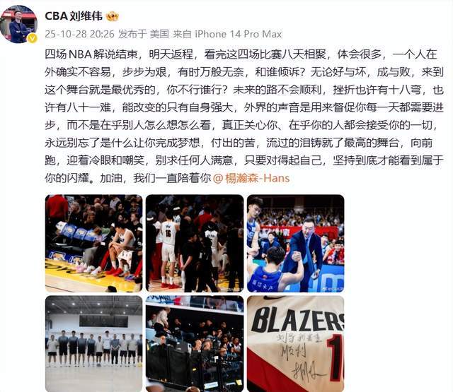 面对爱徒的困境,刘维伟终于忍不住发声了。10月28日晚间,他在社交平台公开为杨瀚森打气,一席话尽显爱徒心切。