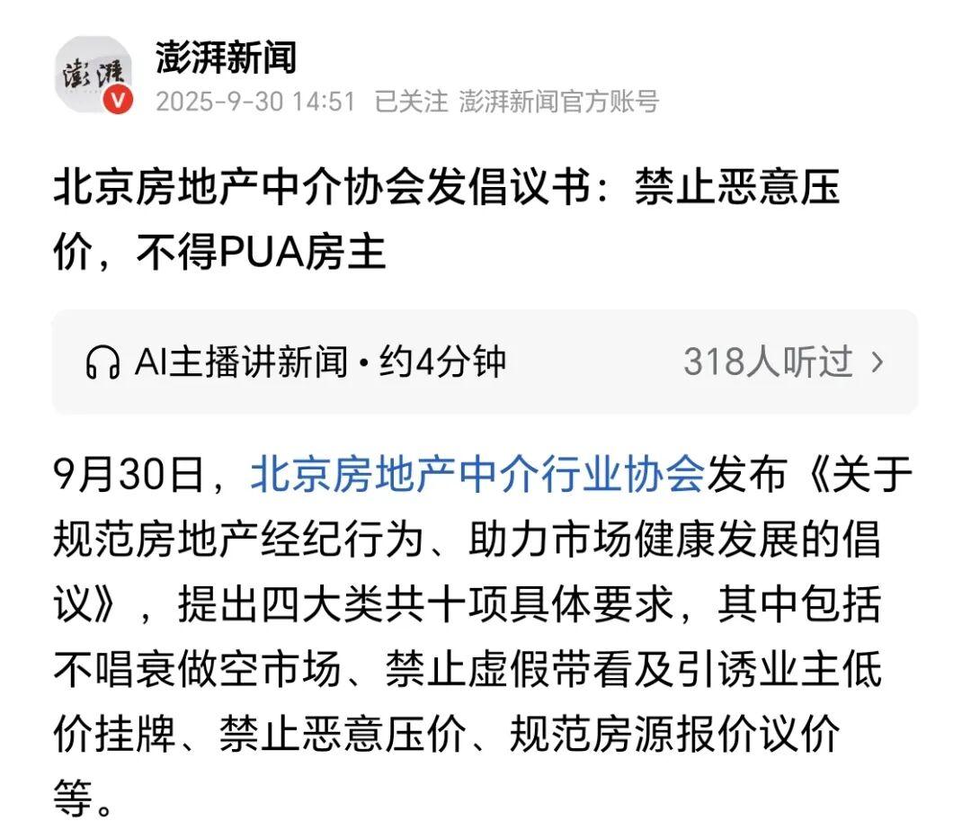 例如,9月30日,北京房地产中介行业协会发布倡议,提出四大类共十项具体要求,包括不唱衰做空市场、禁止虚假带看及引诱业主低价挂牌、禁止恶意压价、规范房源报价议价等。