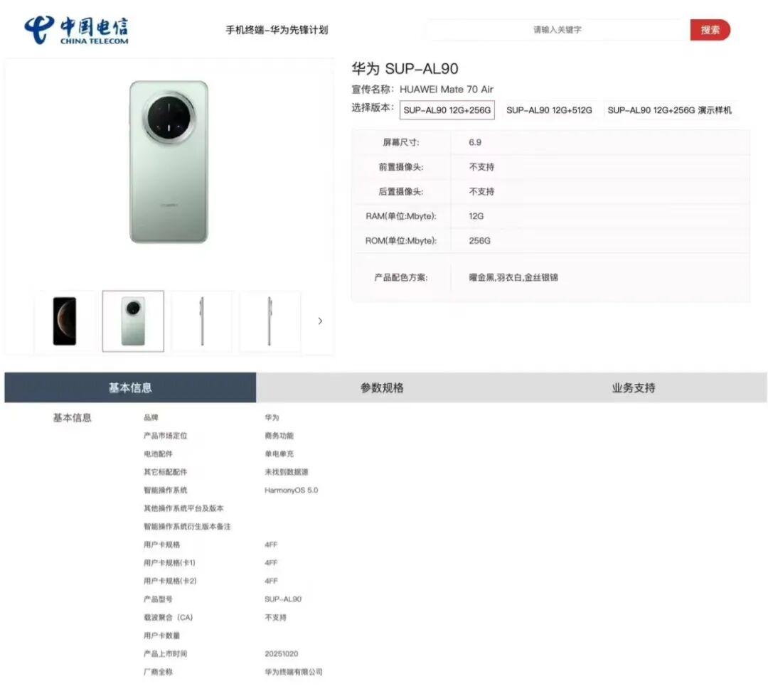 目前,电信产品库中展示的华为Mate70Air有12G+256G和12G+512G两个版本,预计还将推出典藏版,搭载16GB运存。