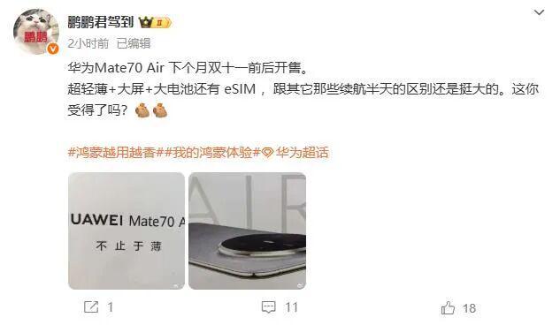 关于华为Mate70Air的发售时间,有博主透露将在双十一前后开售。同时,有消息称华为Mate80系列也将在11月份发布,但华为Mate70Air是否会与Mate80系列一同发布,目前尚不确定。较为统一的说法是,华为Mate70Air将在10月底进行预热,双11期间正式开售。