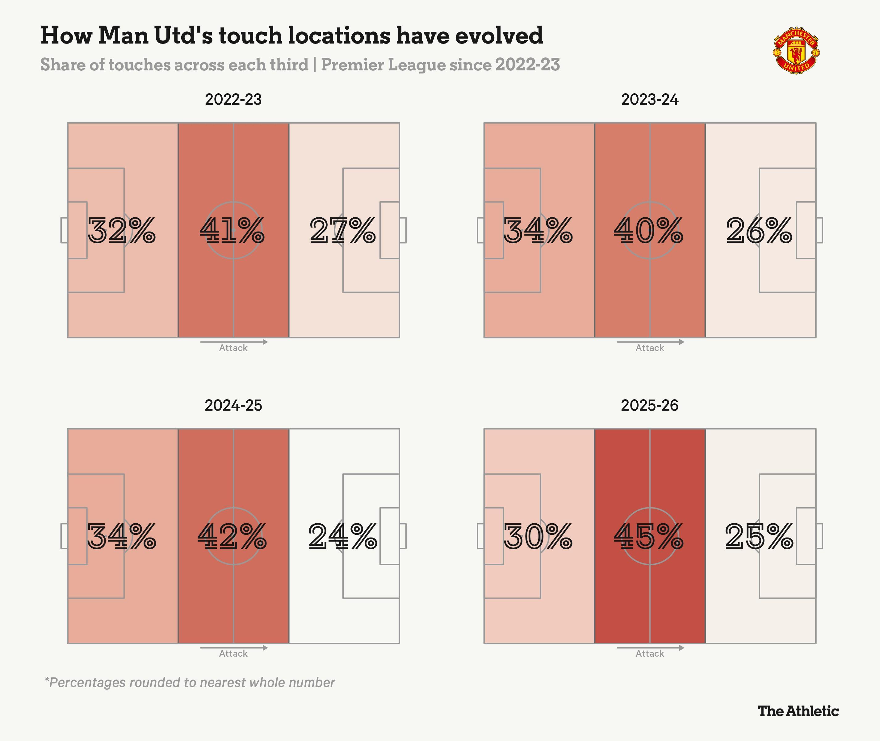 数据对比显示,曼联在防守三区的触球次数发生根本性变化。上赛季,曼联是英超中后场触球次数最多的球队之一,而本赛季这一数据大幅下降,仅阿森纳的后场触球次数更少。具体来看,曼联全场触球中仅有30%发生在自家防守三区,远低于过去三个赛季的平均水平。