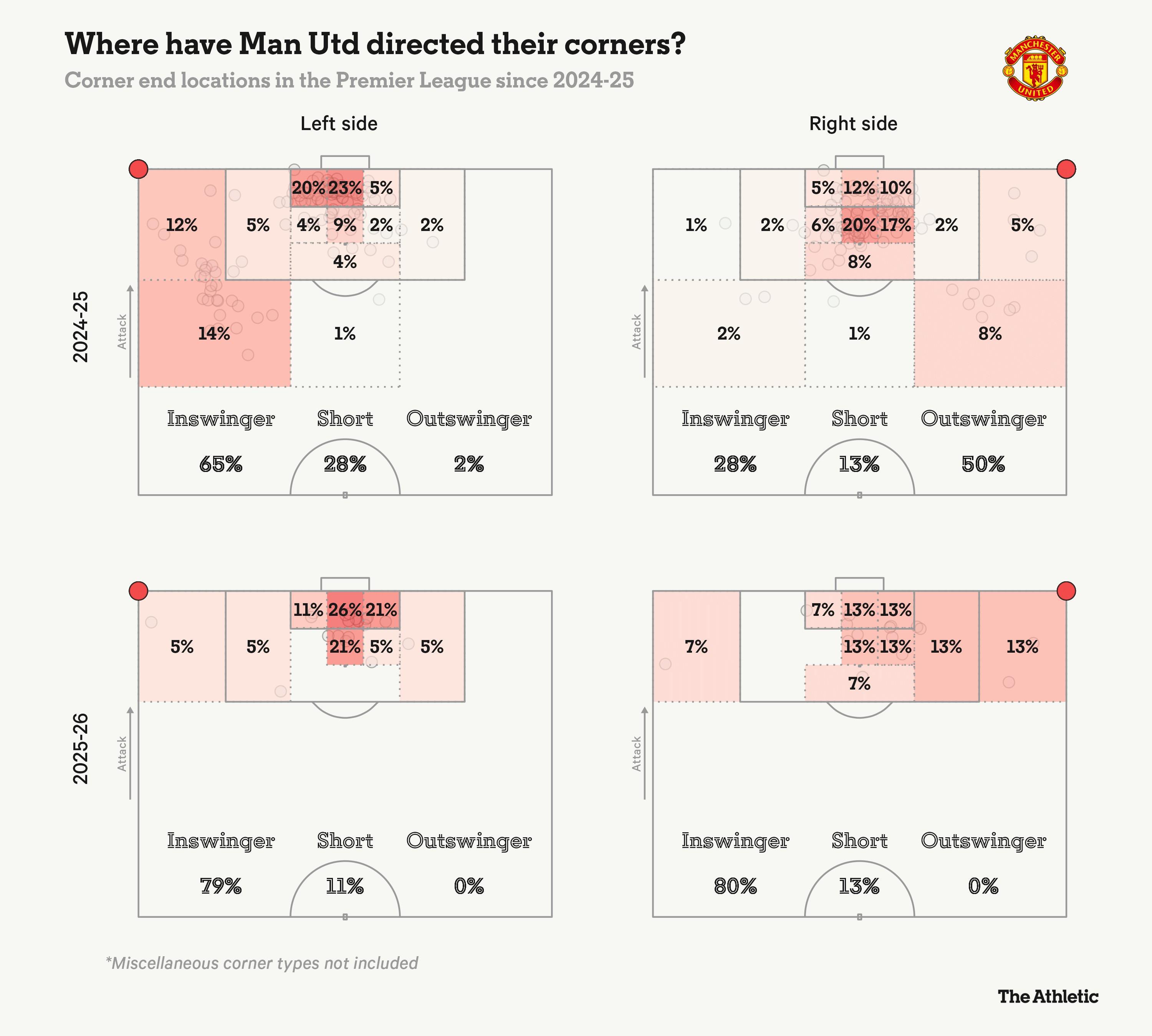 本赛季,曼联在定位球战术上做出重大调整,最引人注目的是外旋角球的全面取消。上赛季,布鲁诺·费尔南德斯与埃里克森作为右脚将主导角球主罚,左脚将阿马德·迪亚洛为第三选择。然而,球队缺乏稳定的左脚主罚者,导致战术单一。