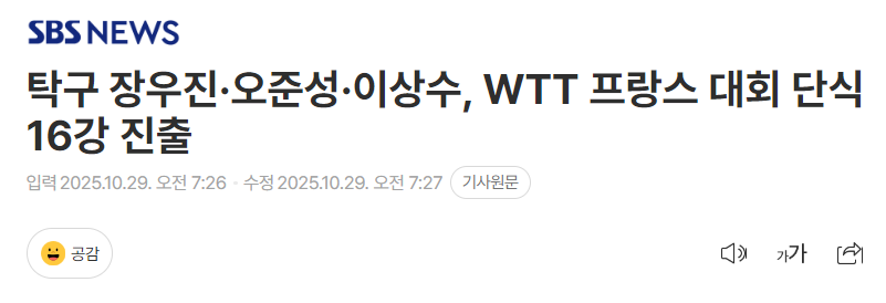 北京时间10月26日,韩国媒体《SBS NEWS》对首个比赛日进行了总结评价。他们指出,韩国队在首个比赛日中取得了3胜2负的成绩,其中张禹珍、李尚洙、吴晙诚三位选手一同携手晋级男单16强。
