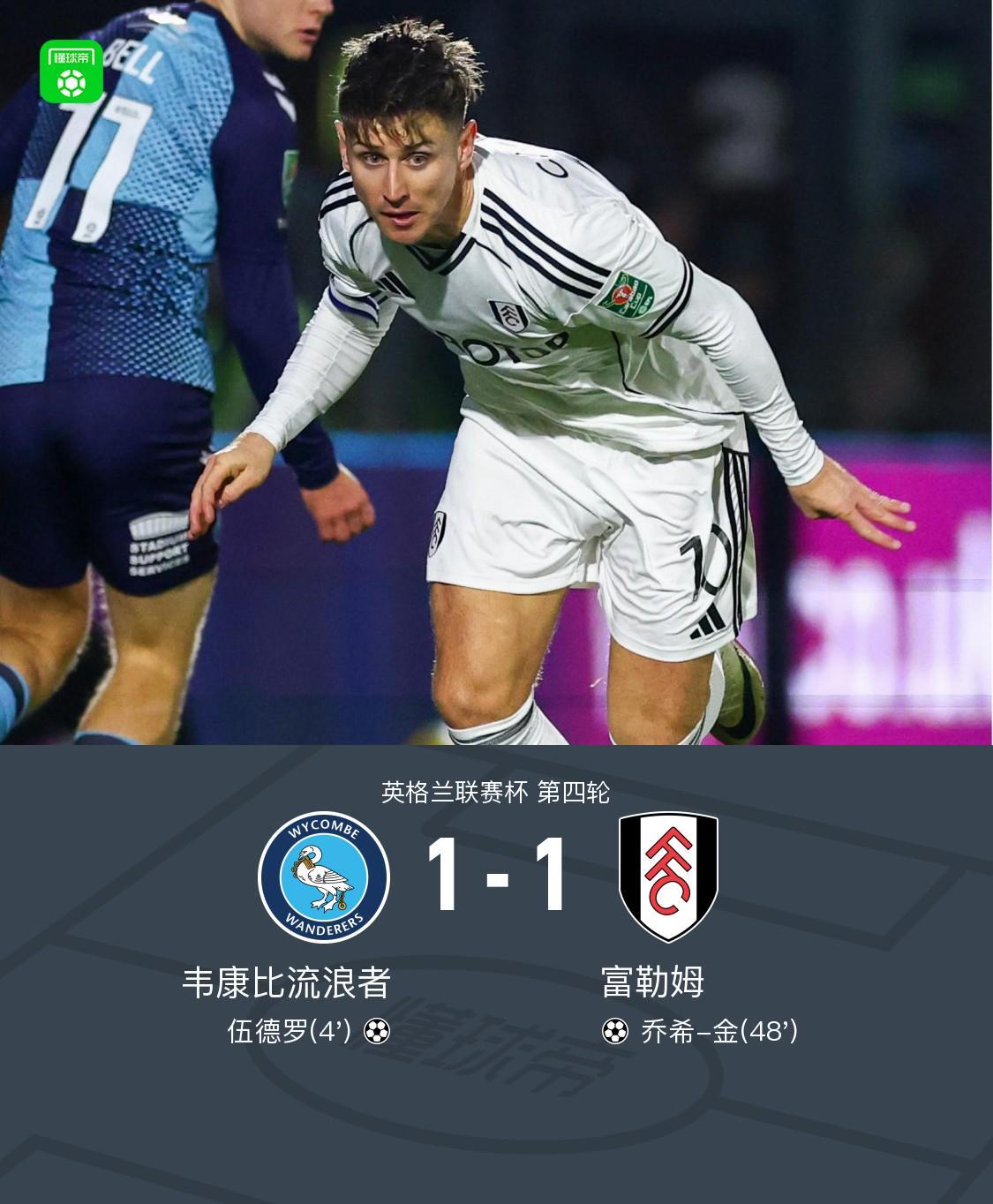 北京时间10月29日,英格兰联赛杯第四轮迎来一场焦点对决,韦康比流浪者坐镇主场迎战英超劲旅富勒姆。这场比赛充满了悬念与精彩瞬间,最终双方以1-1的比分握手言和。