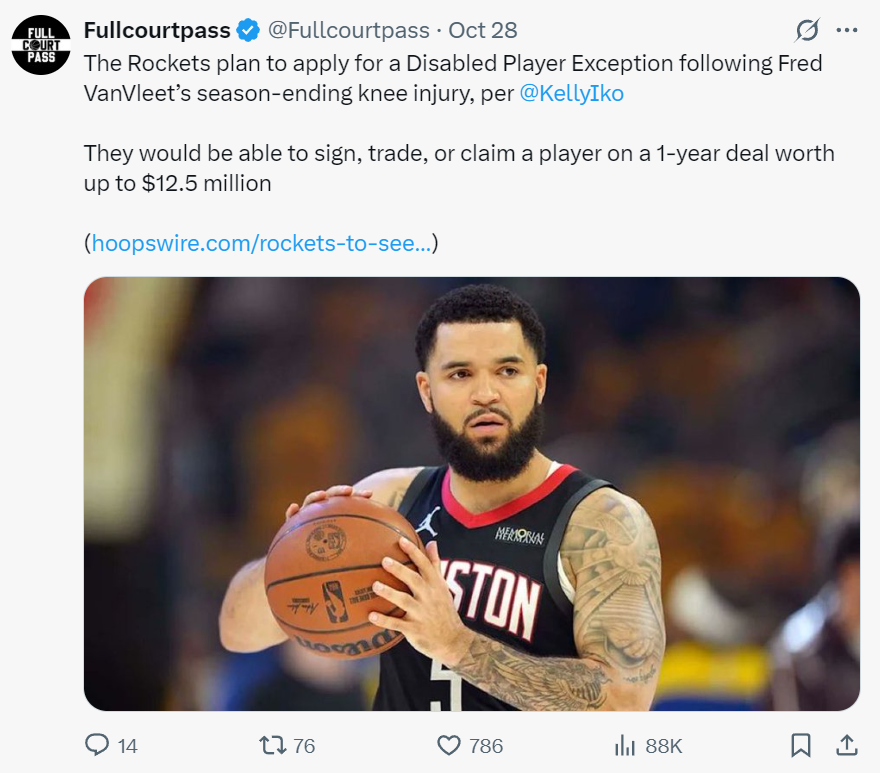 伤病特例申请成为焦点话题。据美媒Fullcourtpass报道,火箭队记凯利-伊科透露,球队计划在范弗利特赛季报销情况下申请伤病特例。该特例价值1250万美元,可用于签约、交易或认领年薪不超过此数额的一年期球员,且不计入工资帽。这一操作若成功,将极大提升阵容深度。