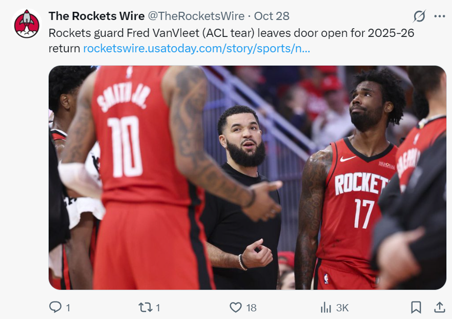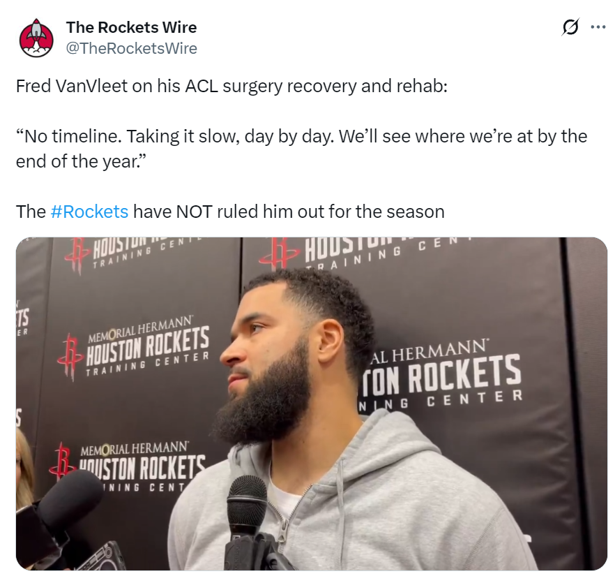 但火箭另一队记本-杜博斯随即泼冷水:范弗利特回归大门并未关闭。其9月下旬遭遇的ACL撕裂伤势,常规康复期为9-12个月。考虑到25-26赛季常规赛4月12日结束,总决赛6月落幕,若恢复顺利,这位后场核心仍有季后赛复出可能。