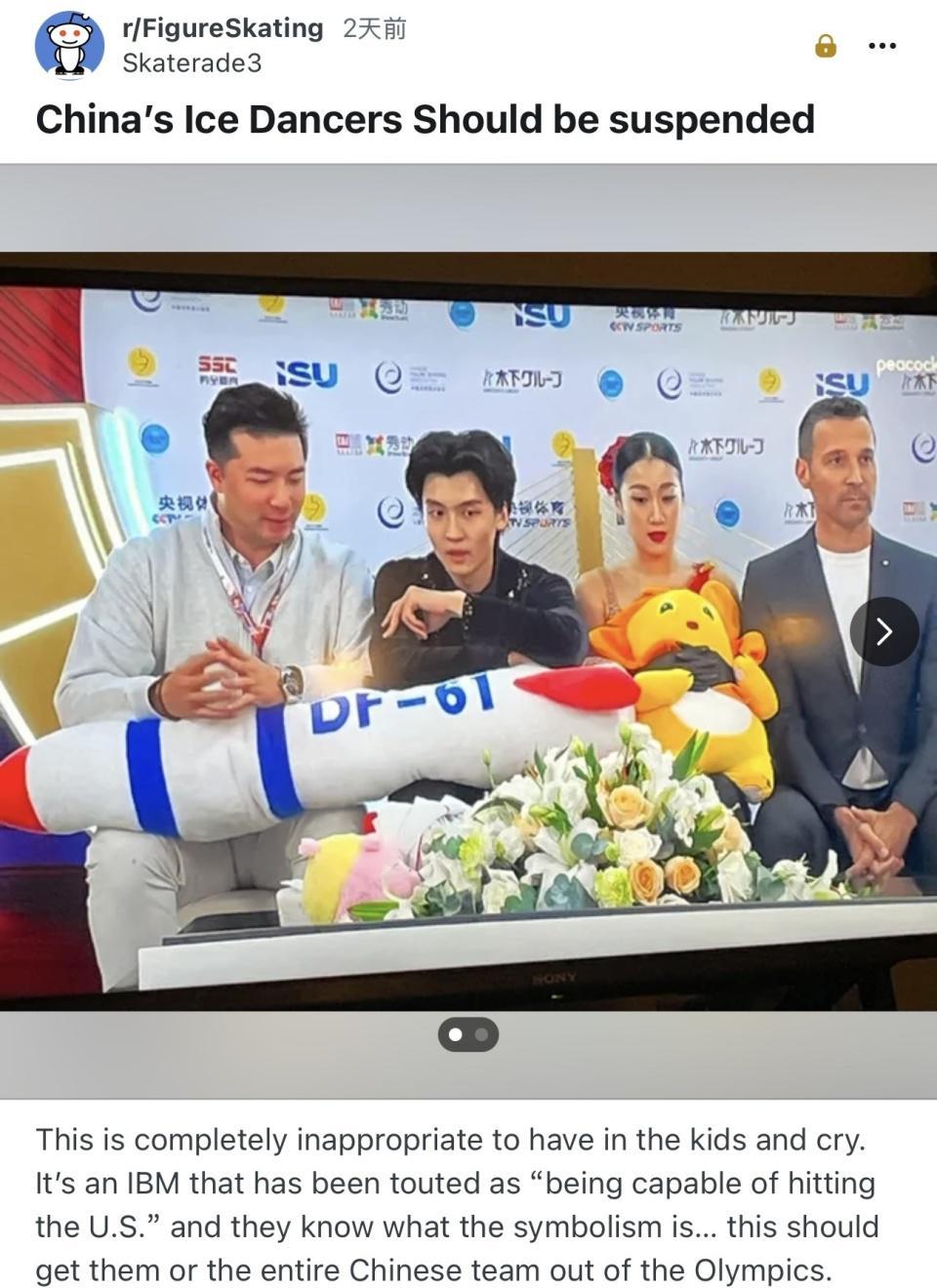 在中国组合任俊霏/邢珈宁完成冰舞表演后,他们捡起了中国观众投掷的“DF-61”毛绒玩具,邢珈宁甚至和教练郑汛在等分区玩起了这个玩具。然而,这一幕却让美国网友感到“破防”,他们发文称这个价值仅42元的玩具对美国构成了威胁,引发了不小的争议。