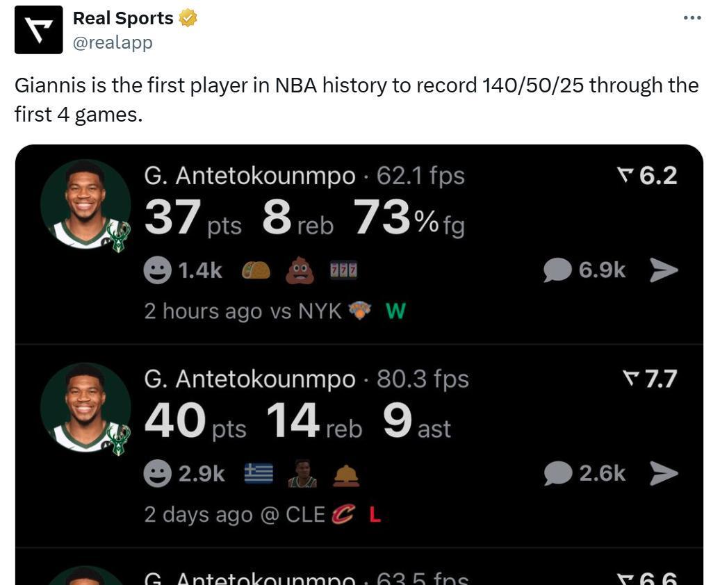 凭借这样的表现,字母哥开季至今已经拿下145分56篮板28助攻,成为NBA历史上首位在前四场比赛就能达成140分50板25助攻的球员。这一壮举无疑让字母哥的名字载入了史册。