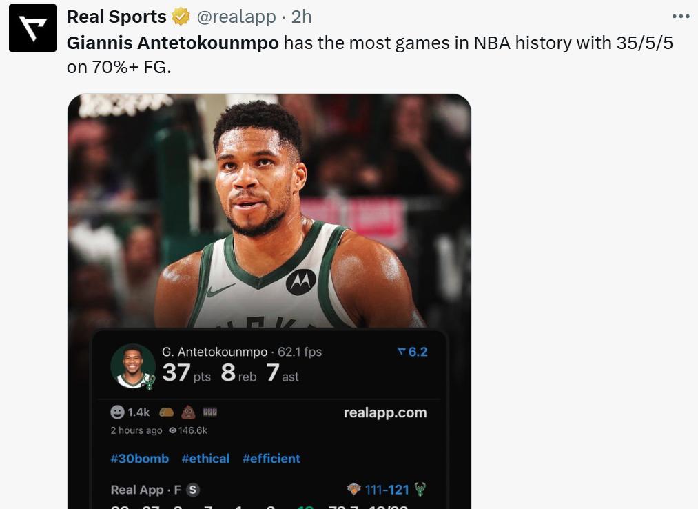 本场面对东部顶级强队之一的尼克斯,字母哥仍旧以22中16的夸张效率爆砍37分8板7助1断2盖帽的全能数据,正负值+18高居全场第一。无论是进攻端还是防守端,字母哥都做到了自己能做的一切。