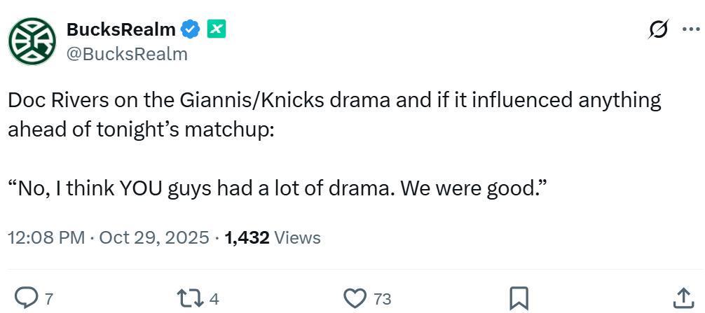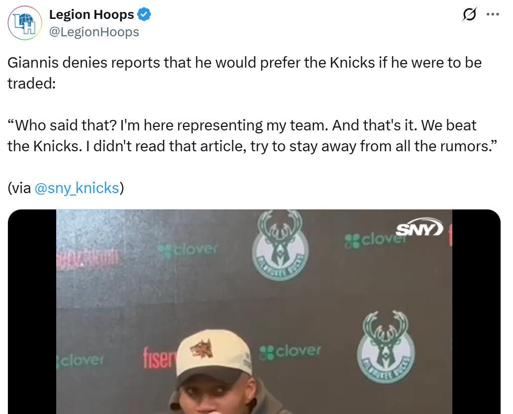 赛后字母哥也再次公开回应自己愿意加盟尼克斯的交易流言,直接予以否认。他反问道:“谁说的?我没看到那篇报道,我带领着这支球队征战,击败了尼克斯,就是这样,尽量远离谣言吧!”主帅里弗斯也在赛后被问到相关问题,老里笑着表示只是你们那边闹得沸沸扬扬,球队更衣室完全没有问题。