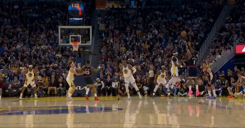 第二节进入到最后4分钟,哈登再次开启得分模式,反击中一步过掉霍福德,库里只能赔上犯规,登哥两罚全中。下一回合,登哥抢下后场篮板,一个变速上篮再拿2分。第二节尾声阶段,哈登超远三分手起刀落,带领快船以49-46反超比分结束上半场。值得一提的是,登哥半场居然0助攻,但得到20分。
