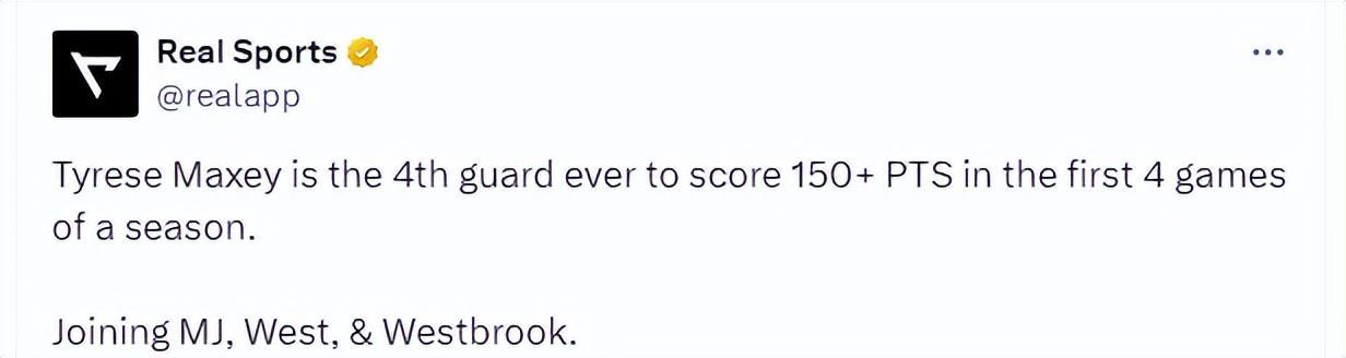 马克西的火热状态绝非昙花一现。新赛季四场比赛,他先后交出40分、28分、43分和39分的恐怖数据,累计得到150分成为NBA历史上第四位在赛季前四场至少轰下150分的后卫,前三人分别是迈克尔·乔丹、杰里·韦斯特和拉塞尔·威斯布鲁克。这种持续性的高效输出,让NBA记者凯利·伊科发出惊叹:"他有没有可能再拿一次最快进步奖?"