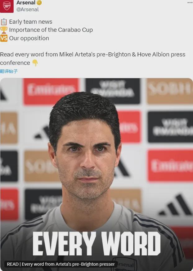 毕竟对手是布莱顿,且阿森纳不能过早被淘汰出联赛杯。多线作战对于球队来说是一个考验,但也是锻炼球员和保持阵容厚度的机会。因此,轮换是必须的,但估计阿尔特塔还是会派出一个较强的阵容。