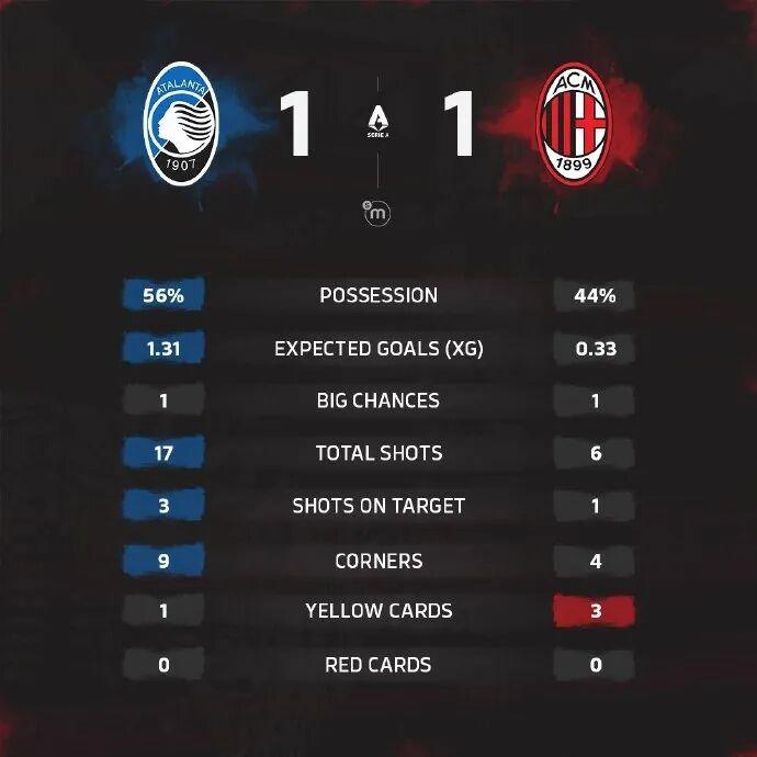 下半场补时5分钟。最终全场比赛结束,亚特兰大1-1战平AC米兰。