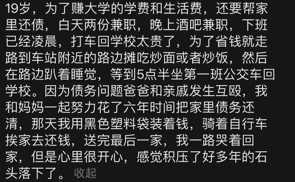 最艰难时30元撑过一个星期的经历刻骨铭心:"饿到看伤感视频流泪,因为哭完会暂时忘记饥饿。"失业四个月来,唯一的工作只干了19天,现在每天为找工作焦虑到失眠。"什么时候能不再为钱发愁,哪怕只是不用欠债,我就谢天谢地了。"