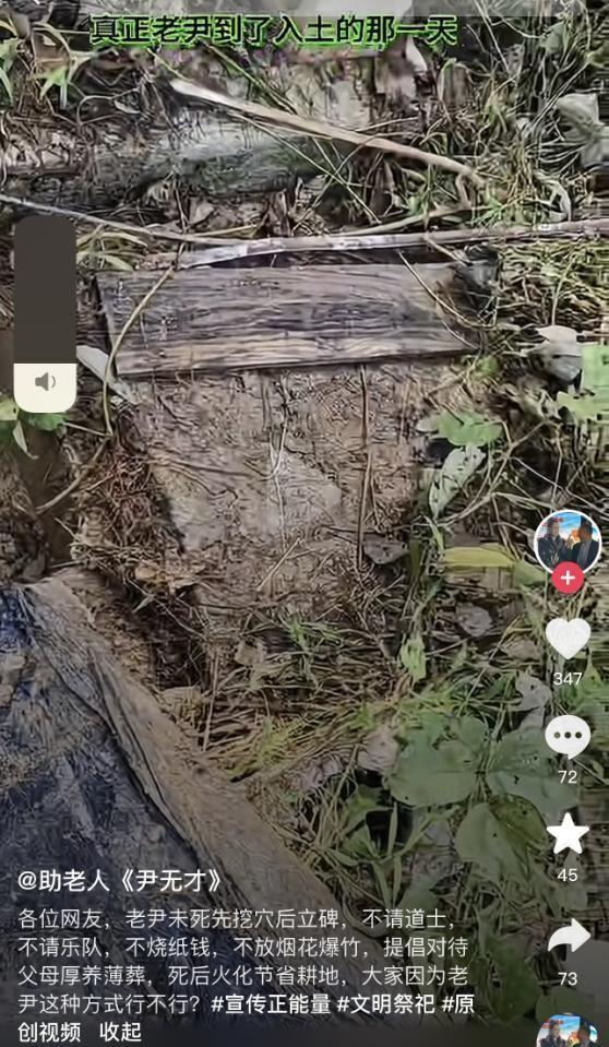 更令人意外的是,老尹在9月14日向网友展示了自己的墓地,位于去世父亲身旁,墓碑已立好,颜色质地与父亲墓碑一致。但墓碑上在自己名字前多加了“未亡人”三个字,并刻有“打破世俗我先行”的字样。老尹还表示,自己去世后不请道士、乐队,不烧纸钱、不放烟花爆竹,火化以省耕地。