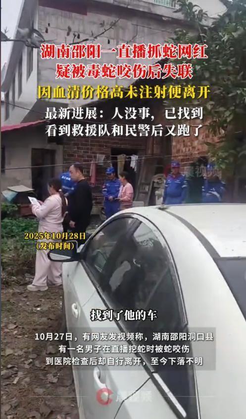 红星新闻 2025-10-28《湖南邵阳一“直播抓蛇”网红被毒蛇咬伤后失联,知情人称“他嫌血清贵不肯打”,多方力量寻找》