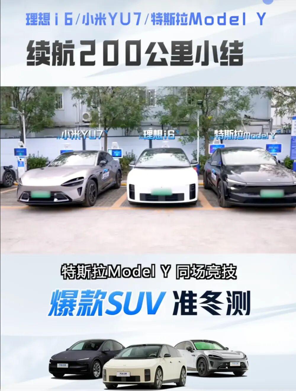 10月24日,汽车之家公布专项测试数据,将小米YU7、特斯拉ModelY、理想i6置于北京五环及周边混合路况进行实测。当日气温3-13℃,测试全程采用不限制动力输出的节能模式,空调设定23℃自动风量,车内载有3名成年乘客,完全模拟家庭出行状态。