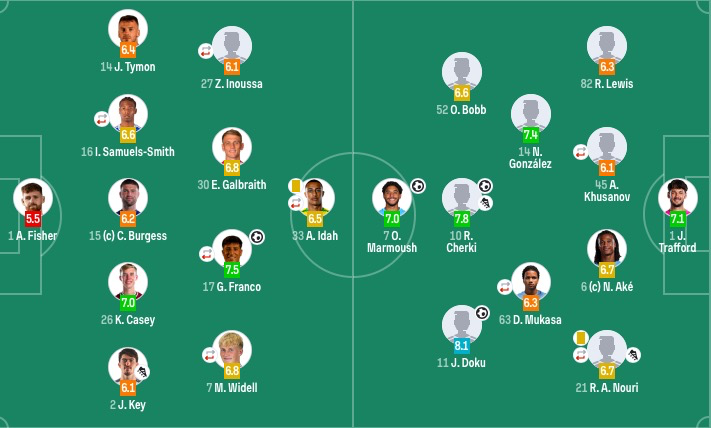 曼城首发:1-特拉福德、82-刘易斯、45-胡桑诺夫(63'5-斯通斯)、6-阿克、21-努里(63'24-格瓦迪奥尔)、14-尼科-冈萨雷斯、63-穆卡萨(63'47-福登)、52-鲍勃、10-谢尔基、11-多库、7-马尔穆什