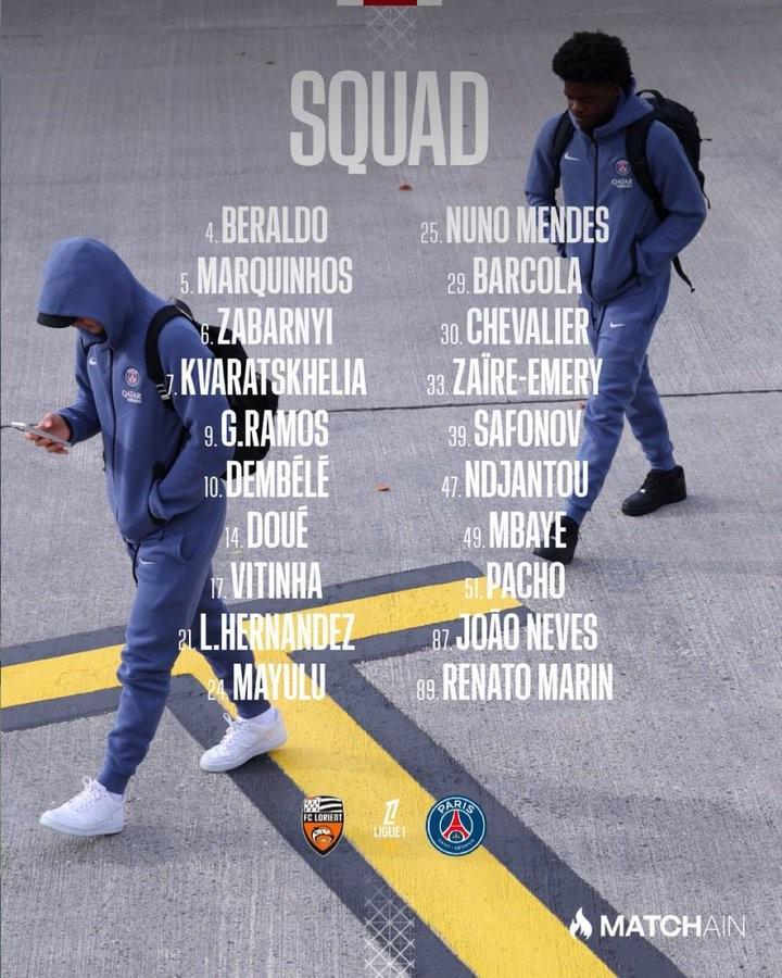以下是巴黎圣日耳曼客战洛里昂的完整大名单: