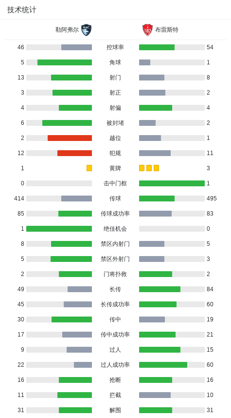技术统计:控球率接近,勒阿弗尔把握机会能力更强