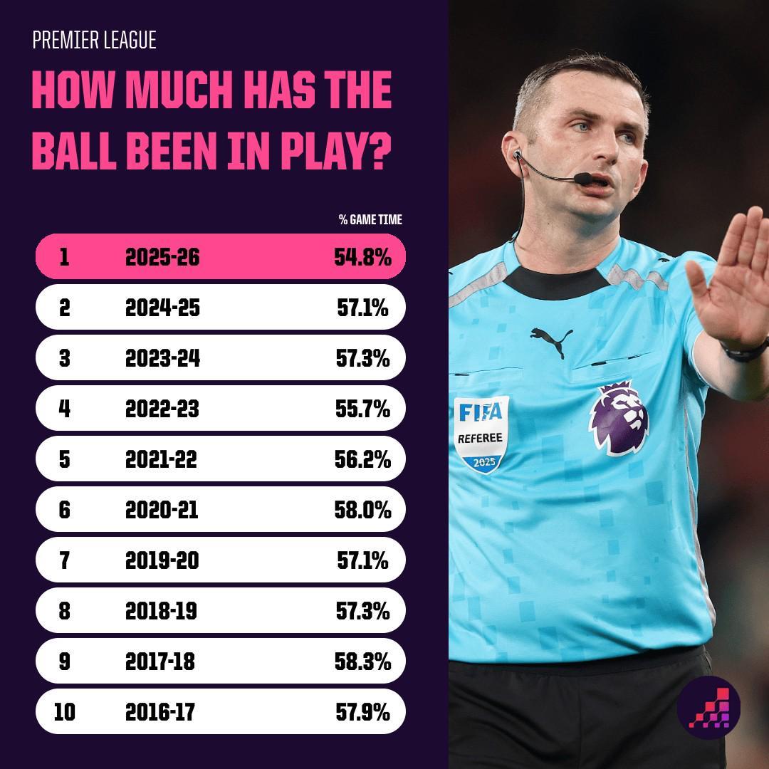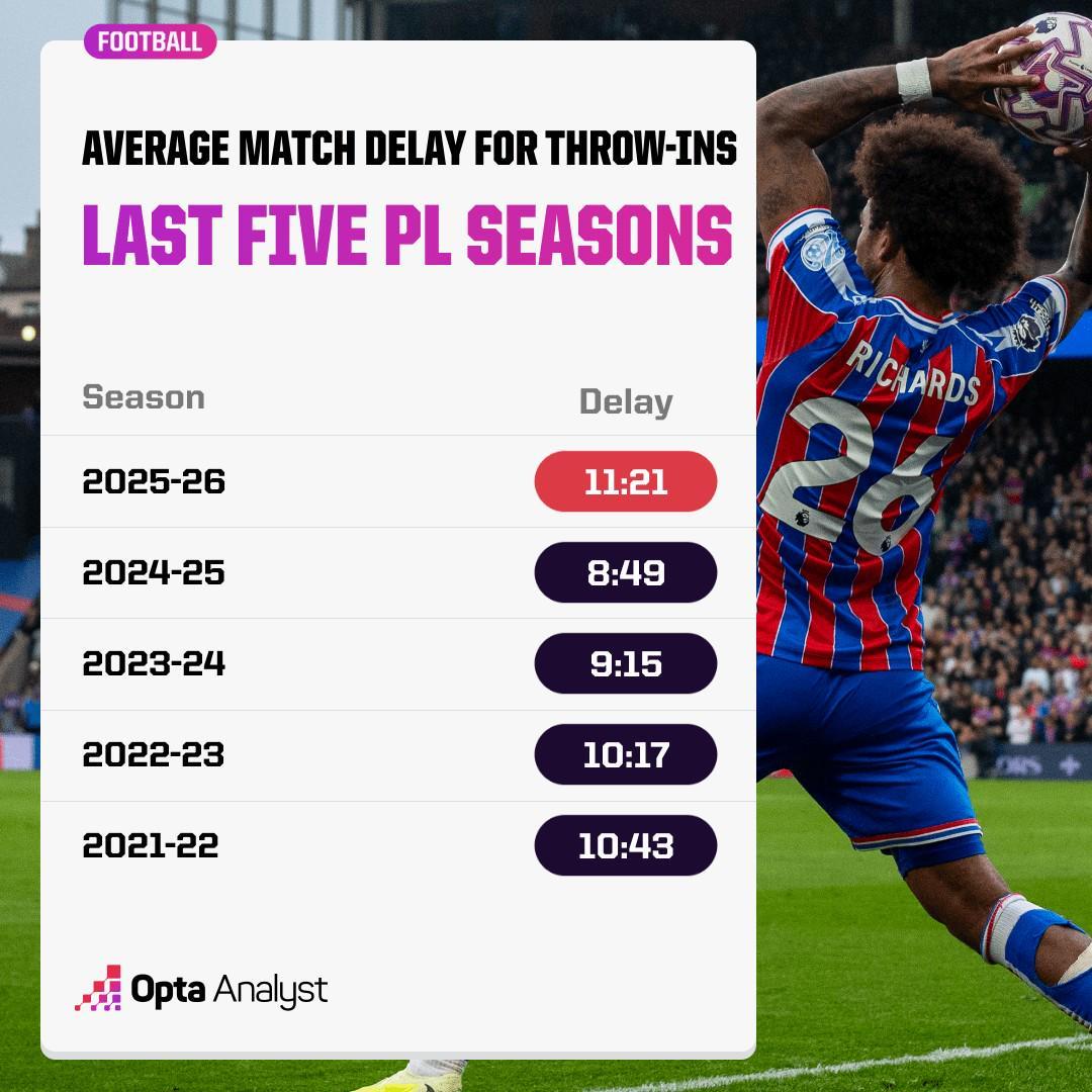另一方面,定位球战术的过度使用也引发了球迷和专家的担忧。许多球迷认为,定位球战术既枯燥又乏味,尤其是当球队在定位球环节投入大量精力却收效甚微时,比赛节奏往往会因此变慢。Opta数据显示,本赛季比赛的有效控球时间占比降至54.8%,低于英超有记录以来(2015-16赛季起)的任何一个赛季。