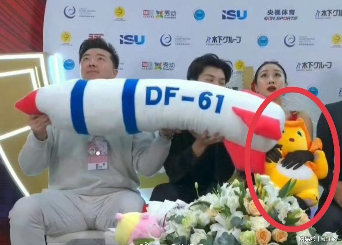 在近期举行的花滑大奖赛中国杯冰舞比赛中,中国选手任俊霏和邢珈宁参加了比赛。在完成自由舞表演后,两位选手来到等待分数的区域。此时,看台上一位观众向赛场扔下了一个形似导弹的长毛绒玩偶。
