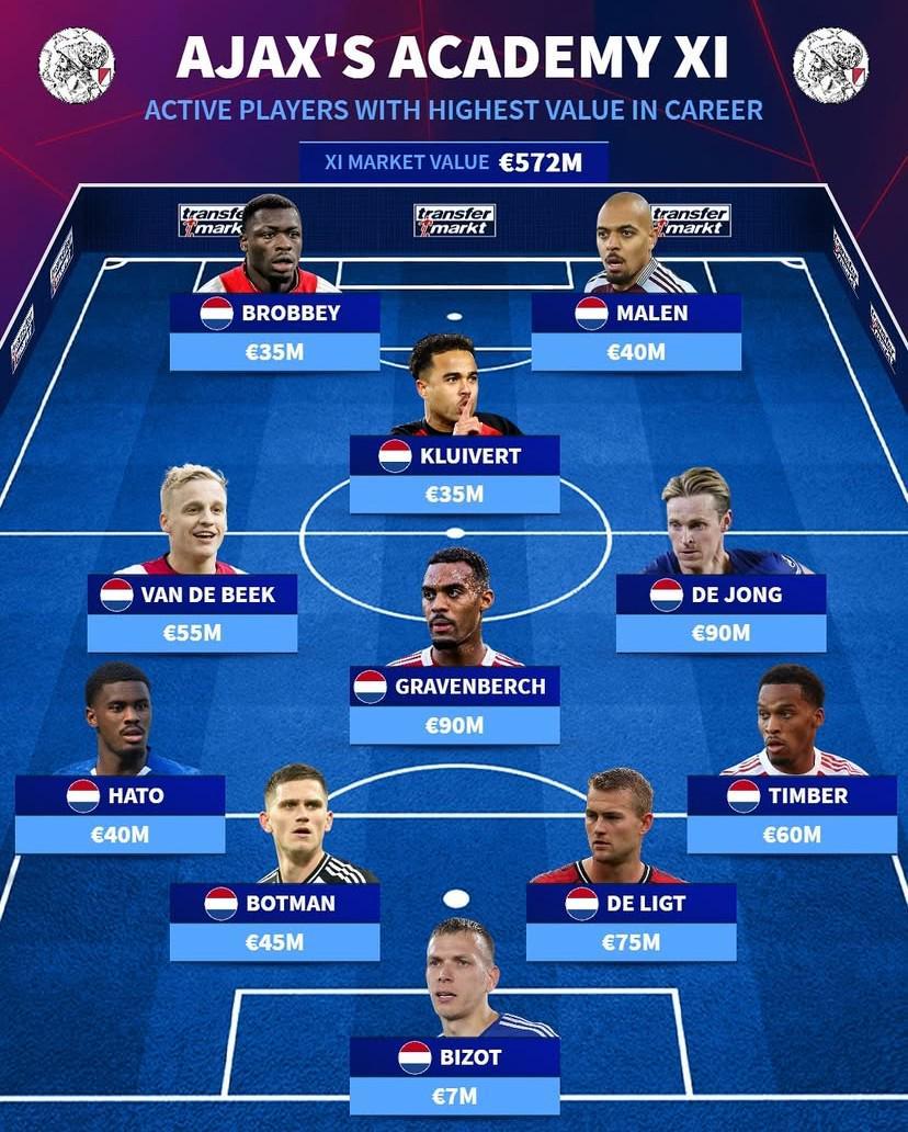 北京时间10月29日,权威转会数据网站德国转会市场(德转)公布了阿贾克斯青训现役历史身价最高的11人阵容。其中,弗朗基-德容与赫拉芬贝赫以9000万欧元并列榜首,德利赫特、廷贝尔、哈托以及范德贝克等球星悉数入选,总身价高达5.72亿欧元。
