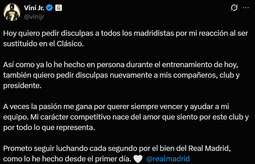 “今天,我想就我在国家德比中被换下时的反应,向所有马德里球迷致以最诚挚的歉意。