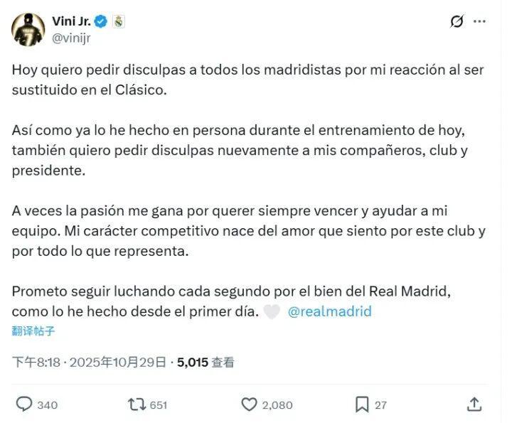 维尼修斯在社交媒体上写道:“今天,我想就我在国家德比中被换下时的反应,向所有马德里球迷道歉。正如我今天在训练中亲自所做的那样,我也想再次向我的队友、俱乐部和主席道歉。有时候,我的热情会让我失去理智;我总是渴望胜利,渴望帮助我的球队。我的好胜心源于我对这家俱乐部以及它所代表的一切的热爱。我承诺会像从第一天起就一直做的那样,每时每刻都为皇家马德里而战。”