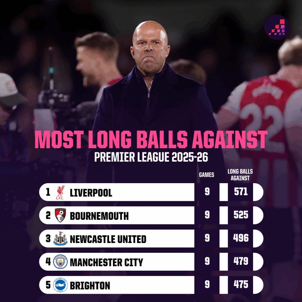 从详细的统计数据中不难发现,利物浦在新赛季的九场英超比赛中,竟然被对手利用长传发起了多达571次的攻击,这一数字在所有英超球队中高居榜首。