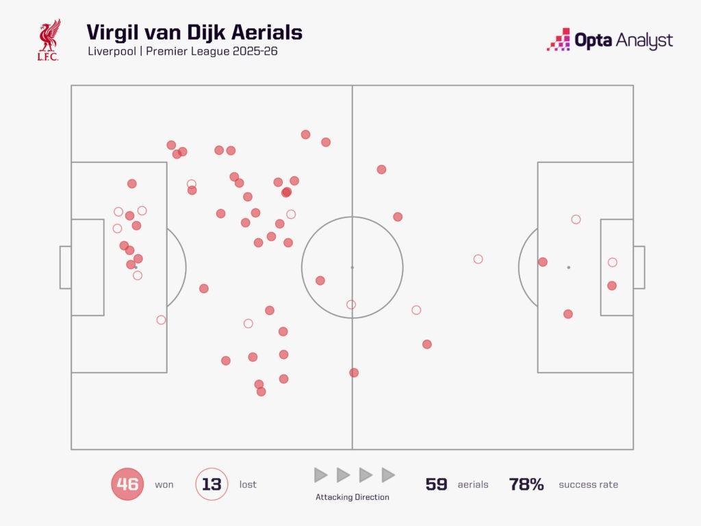 然而,本赛季的范迪克却在这方面的效率上出现了大幅的下滑。尽管从数据上看,他在59次高球一对一的对抗中赢下了46次,成功率高达78%,但实际上,他对于落点的控制却已经大不如前。即便他能够将皮球顶出去,却往往无法确保皮球落在队友的控制范围之内,从而引发了更大的危机。因为范迪克的转身速度变慢了,回追能力也正在逐渐丧失。