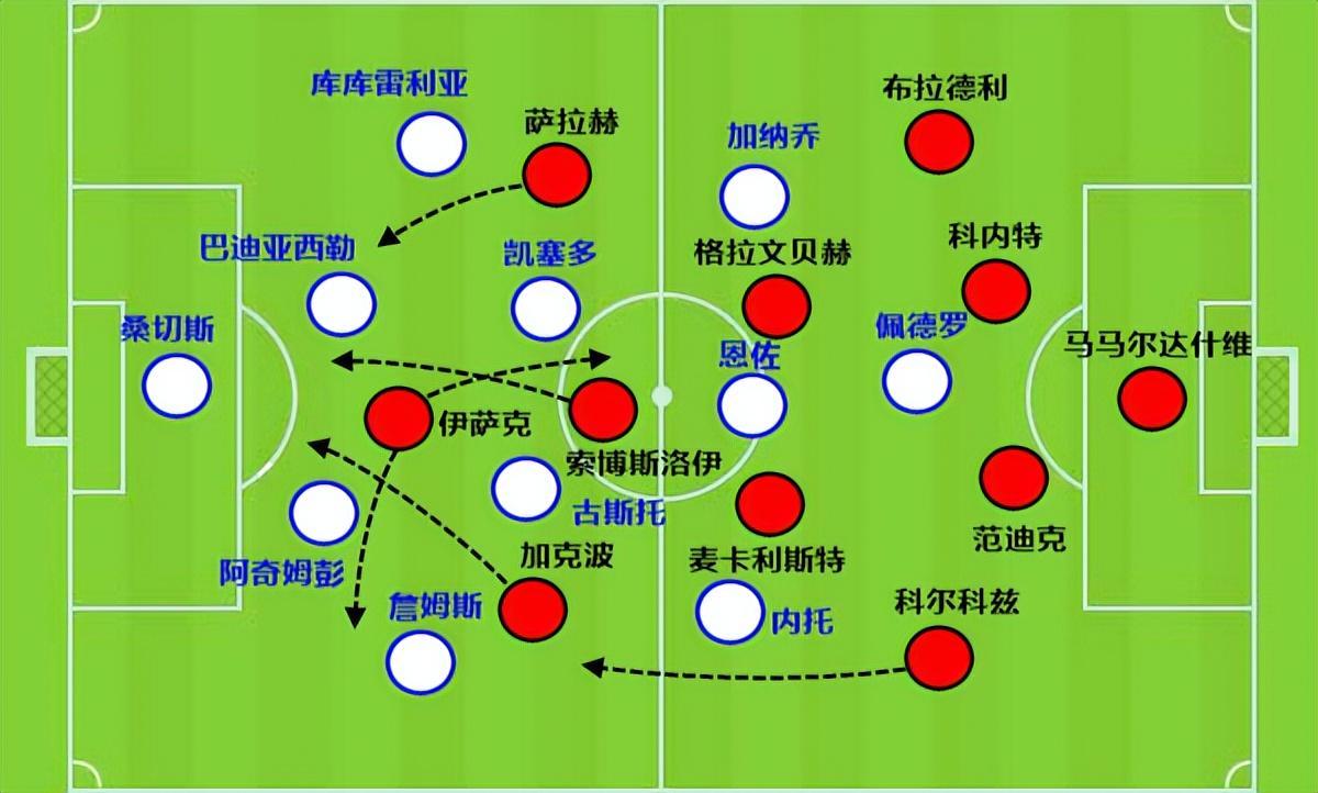 同样地,在边路位置上,伊萨克起速后被切尔西球员包围,但他及时地将球传给了加克波。后者再加速打穿了切尔西的侧翼,可惜中路索博斯洛伊未能把握住这次绝佳的机会。