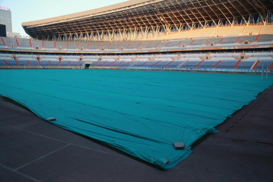 为保证草皮温暖过冬,济南奥体中心在冬季为球场铺上无纺布保暖
