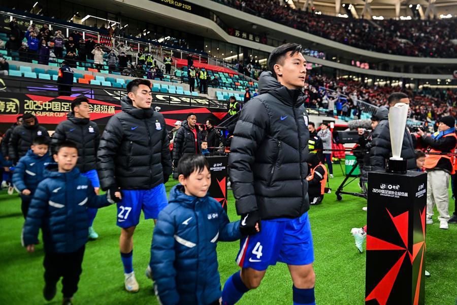 2025年2月7日,超级杯的比赛就已在昆山打响,天气寒冷,双方球员出场时都还穿着羽绒服